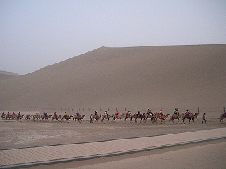 午後からは国内線で空路敦煌へ向かう。敦煌の空港への着陸では飛行機がかなり揺れた。着陸後理由が分かった。砂嵐であった。昨日からの砂嵐で街全体がスモッグに覆われたようにかすんでいた。ガイドさんに尋ねたら、かつて1990年代に1週間ぐらい砂嵐が続いたことがあるそうである。砂漠に近いところだけに理解できたが視界がかなり悪い状態でこれからの観光が心配になった。いったんホテルで休憩して後、鳴沙山(めいさざん)と月牙泉(げっかせん)の見学。砂嵐の影響は残っていたが視界はよくなっていて、巨大な美しい砂山である鳴沙山とそのオアシスである三日月形をした月牙泉を写真に映すことができた。それにしても観光客の多いことにびっくりした。
