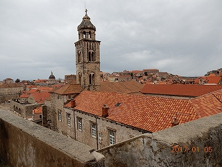 クロアチア観光の目玉スポットとも言うべきところである。ただし台風並みの強風に加えて小雨も混ざる悪天候に見舞われ、ゆっくりと散策というわけにはいかなかった。しかし、せっかくの機会だったので雨にも負けず風にも負けず旧市街を取り囲む城壁の上を歩いた。それがよかった。悪天候ながら城壁から見る風景はすばらしいものだった。歴史の中で時間が止まった空間というのは正にこのことだと思った。オレンジ色に近い屋根の家々が城壁内に密集している中世の街並みが目の前に広がっていて、しかも独り占め状態だった。観光客は一人も見かけなかった。