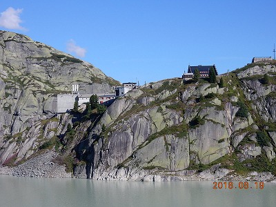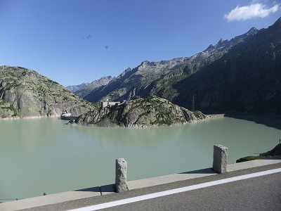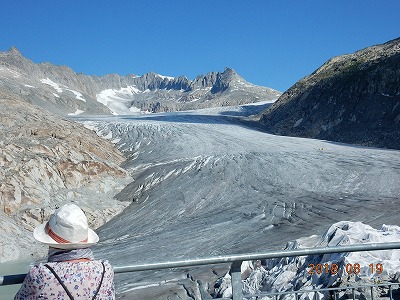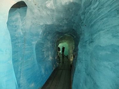 グリンデルヴァルトからバスでアンデルマットへ向かう。その道路は急峻な斜面にへばりつくように作られたヘアピンカーブ状(ヘビ状)の山道で二つの峠を越えた。水の色が少し変わっていた湖(グリムゼル湖)が近くにあるグルムゼル峠。もう一つは、ローヌ氷河が近くにあるフルカ峠である。峠のベルヴェデーレという所にある売店に氷河へ行くことができる入口がある。入って少し歩くと壮大な氷河が眼前に現れた。さらに進むと氷河の内部に続くトンネルのような通路があり、氷河内部をぐるっと一回りできた。”文字通り一面氷の世界!氷河は青かった!” 初めての経験だったので感動した。そのあとは再びスリルのある山道をバスで移動。アンデルマットに着いてからは氷河特急パノラマカーに乗ってブリークへ向かう。ブリーク駅で下車後再びバスでサースフェーへ向かう。サースフェーに着いたのは夕方だったが、ヨーロッパの夏は日が長く、十分明るかった。そこではスイスの最高峰ドムを含むミシャベルアルプスを鑑賞。