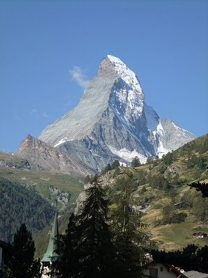 マッターホルン観光のベースといえばツェルマットZermattだが、ツェルマットは環境規制で通常の車の乗り入れが制限されているため、ひとつ手前のテーシュからシャトル列車でツェルマットへ行く。そこからは、地下ケーブルでスネガ展望台(標高2,288m)へ上がる。天候に恵まれ、雲がほとんどかかっていないマッターホルンを見ることができた。おまけにスネガ展望台では地元の人々による民族音楽をきかせてもらった。アルペンホルンやヨーデルを聴きながらのマッターホルンは格別であった。いい思い出を作らせてもらった。