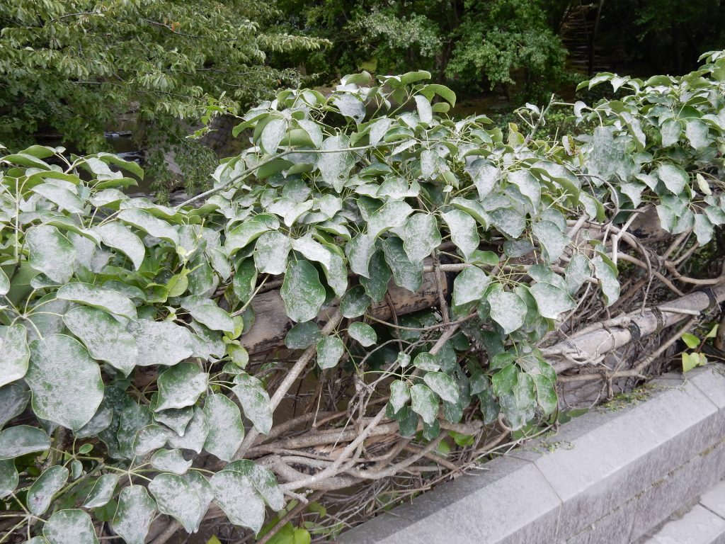 葉に火山灰が積もる