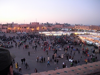 夕方から馬車に乗って新市街から旧市街にかけてゆっくりと観光した。しかし、自動車、バイク、自転車、そして馬車が競争するかのように交錯する交通事情であり、少し危ない感じであった。その後、そのままマラケシュ観光の定番ジャマ・エル・フナ広場へ馬車で乗り付けた。大道芸人、物売り、いろいろなものが食べられる屋台、普通の商店などが集積した活気のあるエンターテインメント広場という感じであった。ただ現地ガイドさんからナップサックは後ろでなく前に掛けるようにというアドバイスがあった。これだけの人が集まっていれば、そういう人がいても不思議はないと思うぐらいのにぎわいであった。
